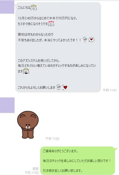 ![]() | こんにちは(*'ω'*) 12月に40万からはじめて半年で70万円になり、 もうすぐ倍になりそうです(*‘ω‘ *) 最初は何もわからなったので このアズシステムを使いだしてから、 これからもよろしくお願いします♡ |