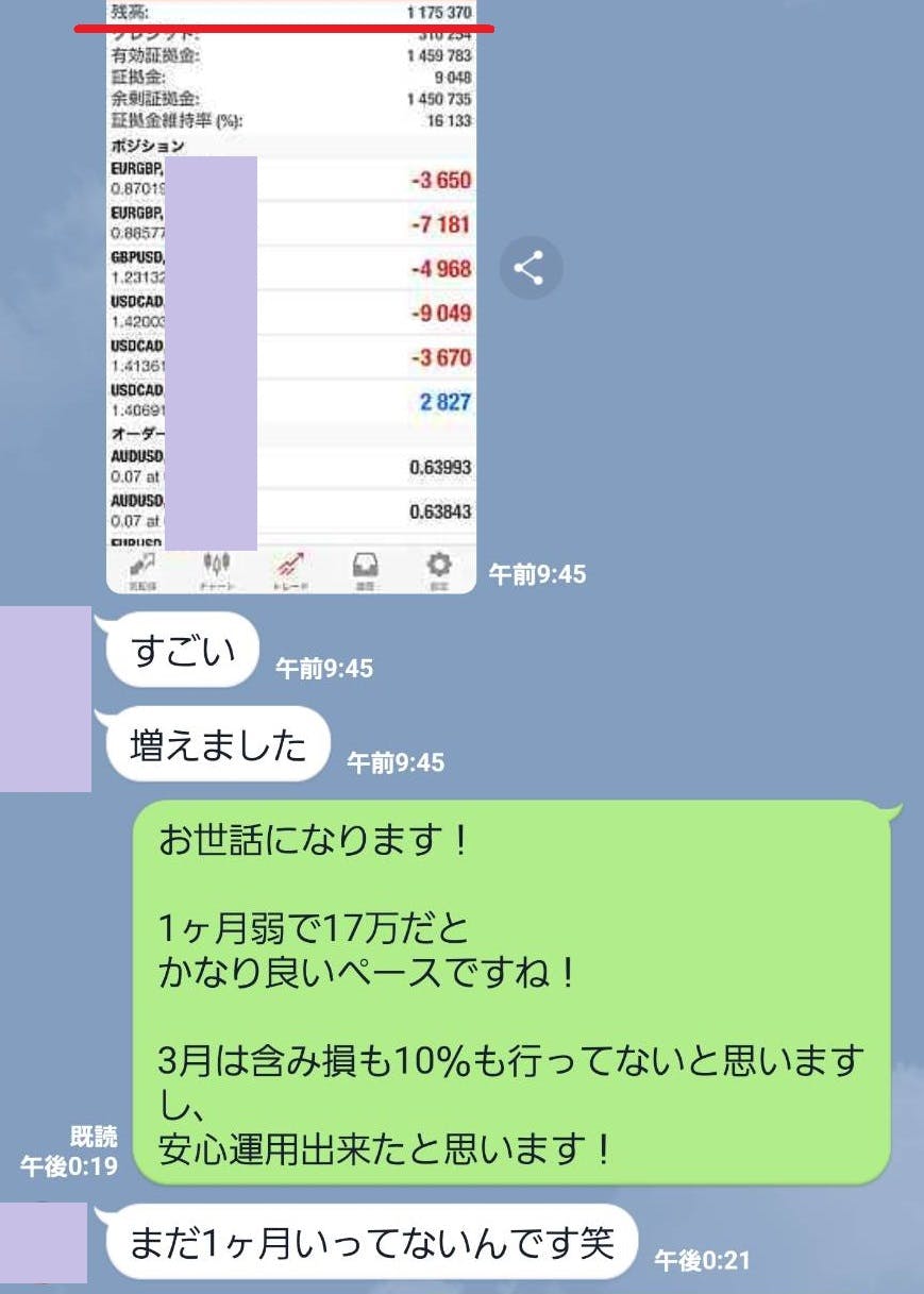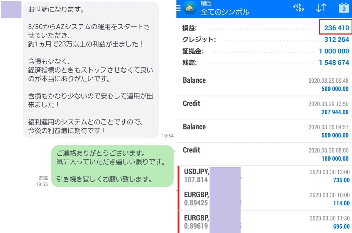 ![]() | 3/30からAZシステムの運用をスタートさせていただき、 約1ヵ月で23万以上の利益が出ました!含損も少なく、 経済指標のときもストップさせなくて良いのが本当にありがたいです。含損もかなり少ないので安心して運用が出来ました!複利運用のシステムとのことですので、今後の利益増に期待です! |