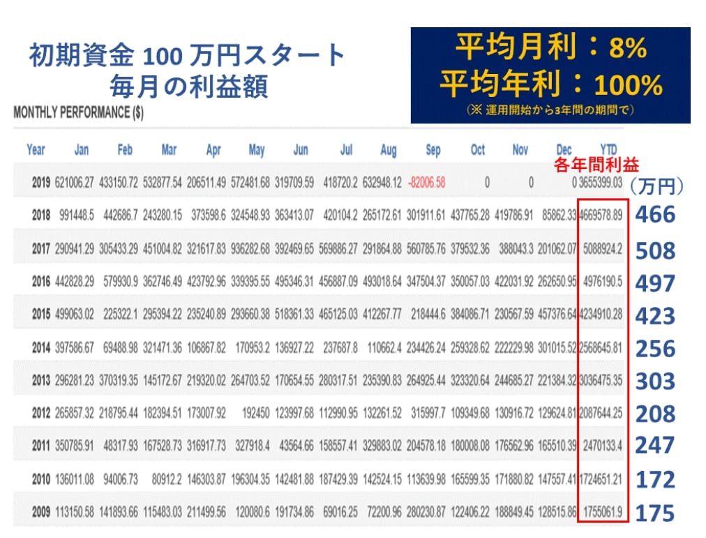 毎月、一定以上の利益を獲得しており、複利機能により、年々利益額は増えております。