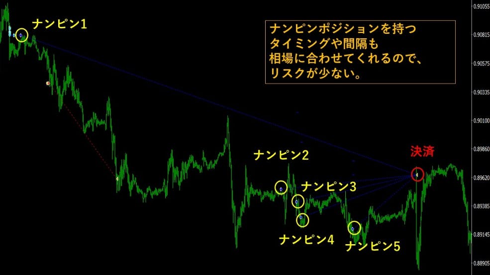 その後、相場が落ち着いて、利益になりやすい相場環境が来ると、ナンピンを再開し、結果利益になる確率が高くなります。