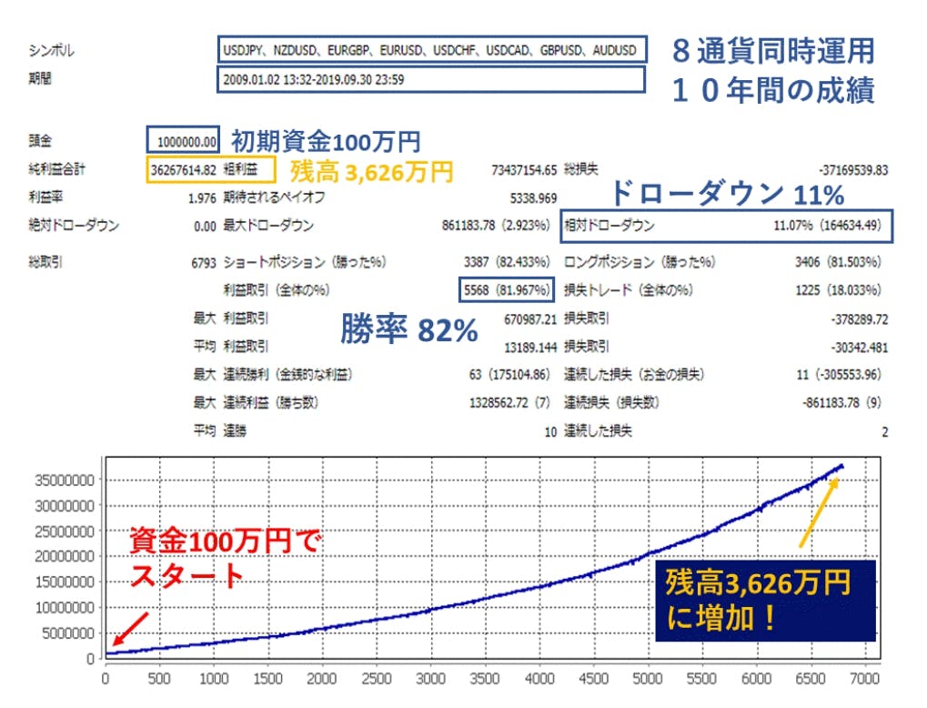 10年間の運用により、初期資金100万円が3,626万円と36倍になっています。