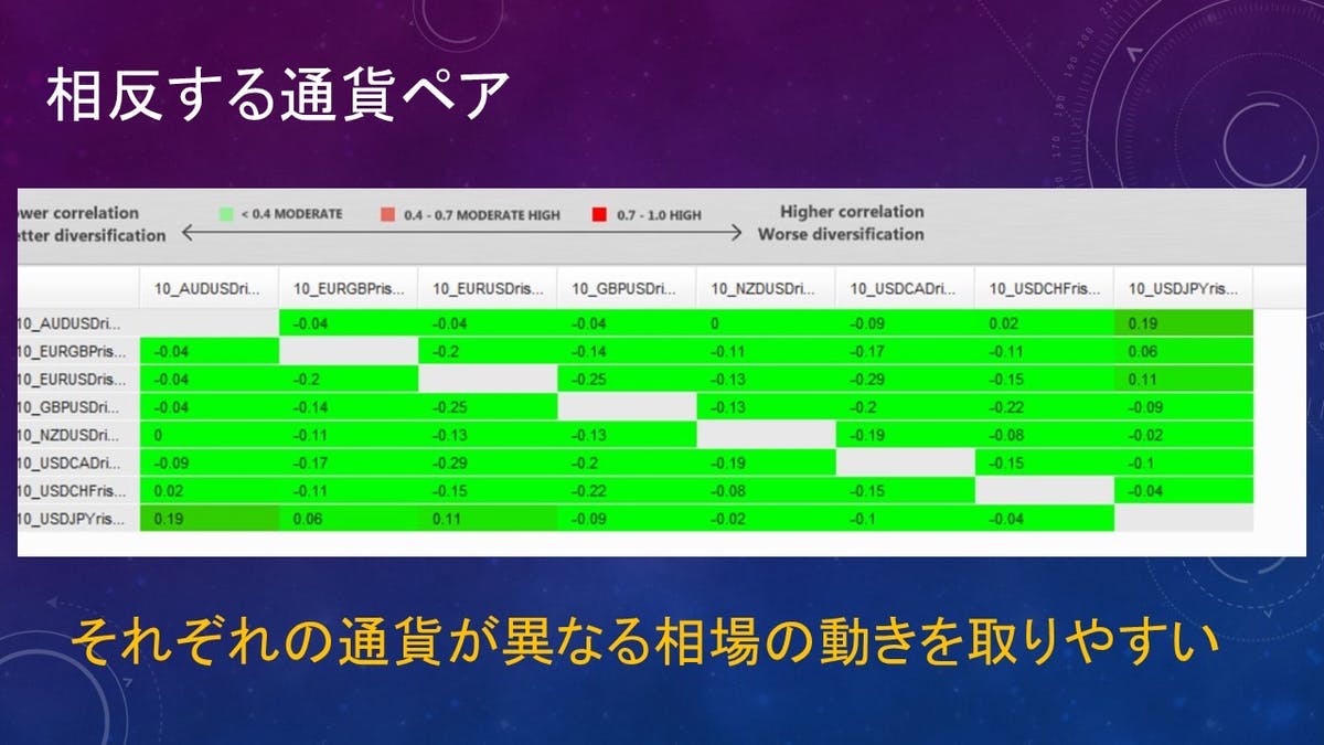 少し専門的な話になりますが、各通貨ペアの動きに相関関係が見られない場合(似た動きをしていない場合)は、緑色で示されます。